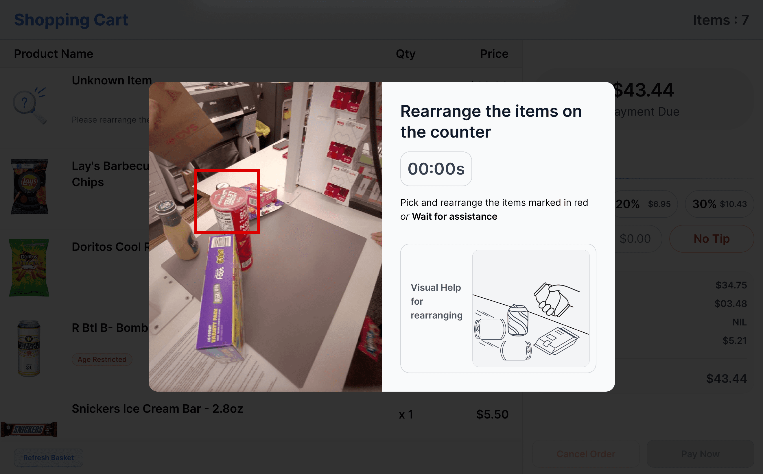 It also shows how unknown items are gracefully intercepted, enabling quick cashier intervention while keeping the customer journey uninterrupted.