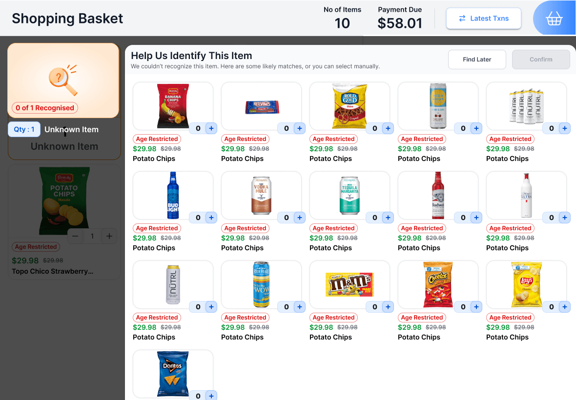 Cashiers can browse the menu and assign the correct item to resolve unknown scans. If the issue repeats, the cashier can train the item for future recognition.