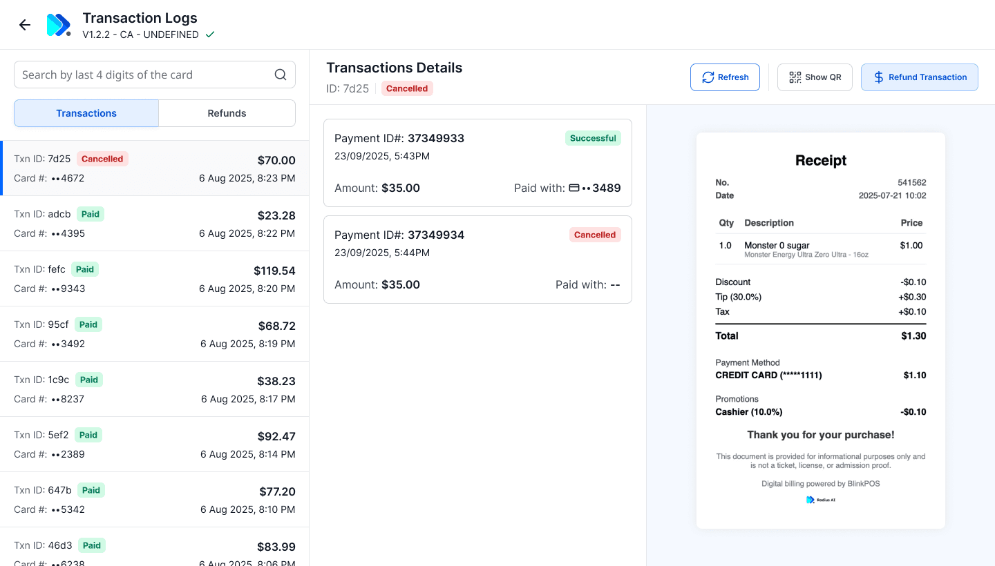 Cashier can manually "print receipts" or "refund" transactions
